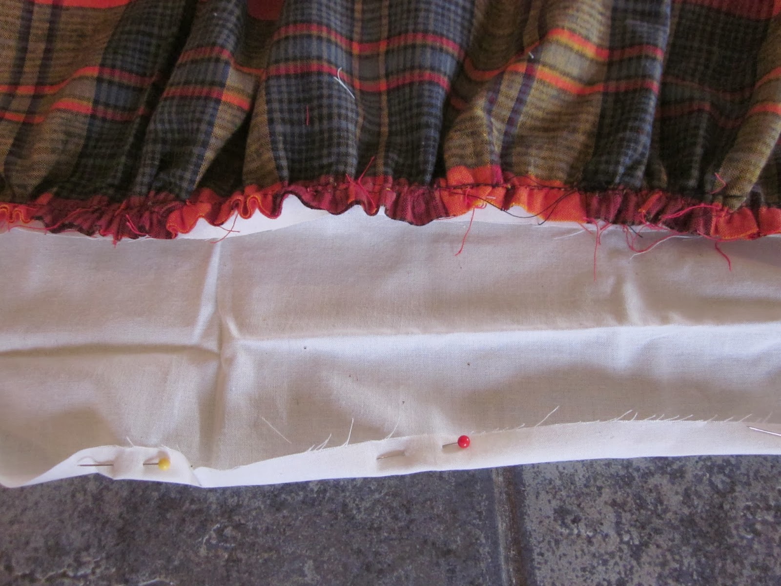 4. Placing the pretty sides together, pin the strip of cream fabric to the top of your ruched flannel fabric. This is going to be the waistband. Sew down.